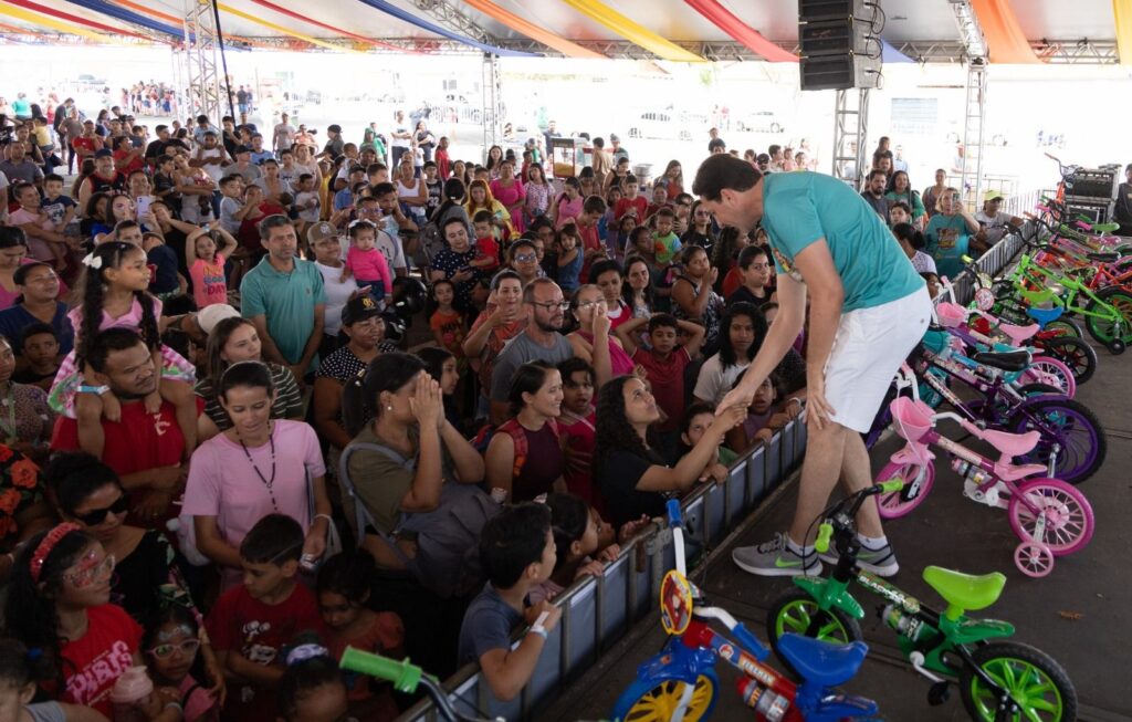 “É uma alegria grande fazer a alegria das nossas crianças. Olha só a felicidade delas! Hoje é um dia de ser criança, inclusive tem adulto sendo criança aqui também”, afirmou o prefeito Leandro Vilela durante o evento.