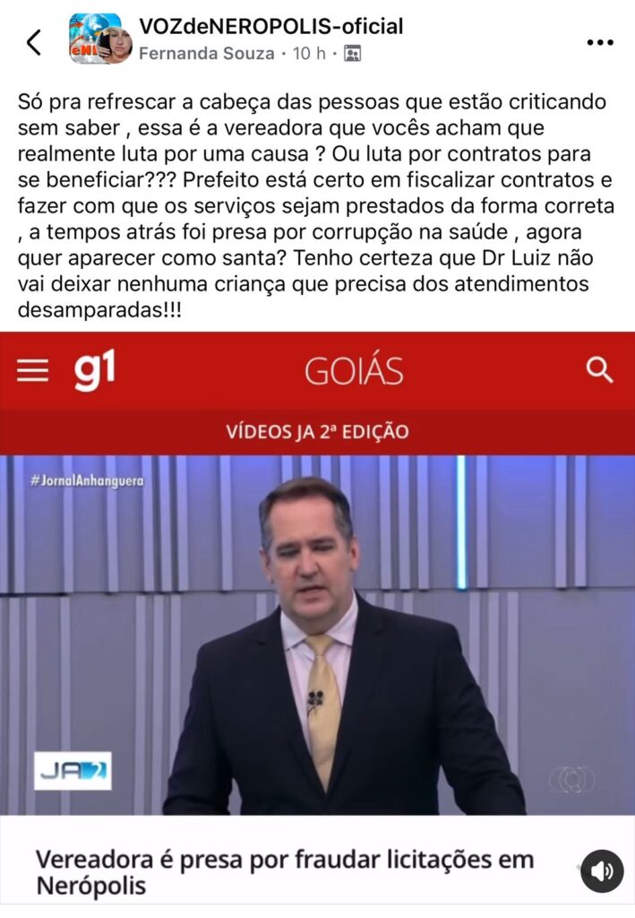 “Essa é a vereadora que vocês acham que luta por uma causa”, questionou a postagem que trouxe a reportagem da TV Globo sobre a operação do Ministério Público de Goiás que levou a vereadora presa.